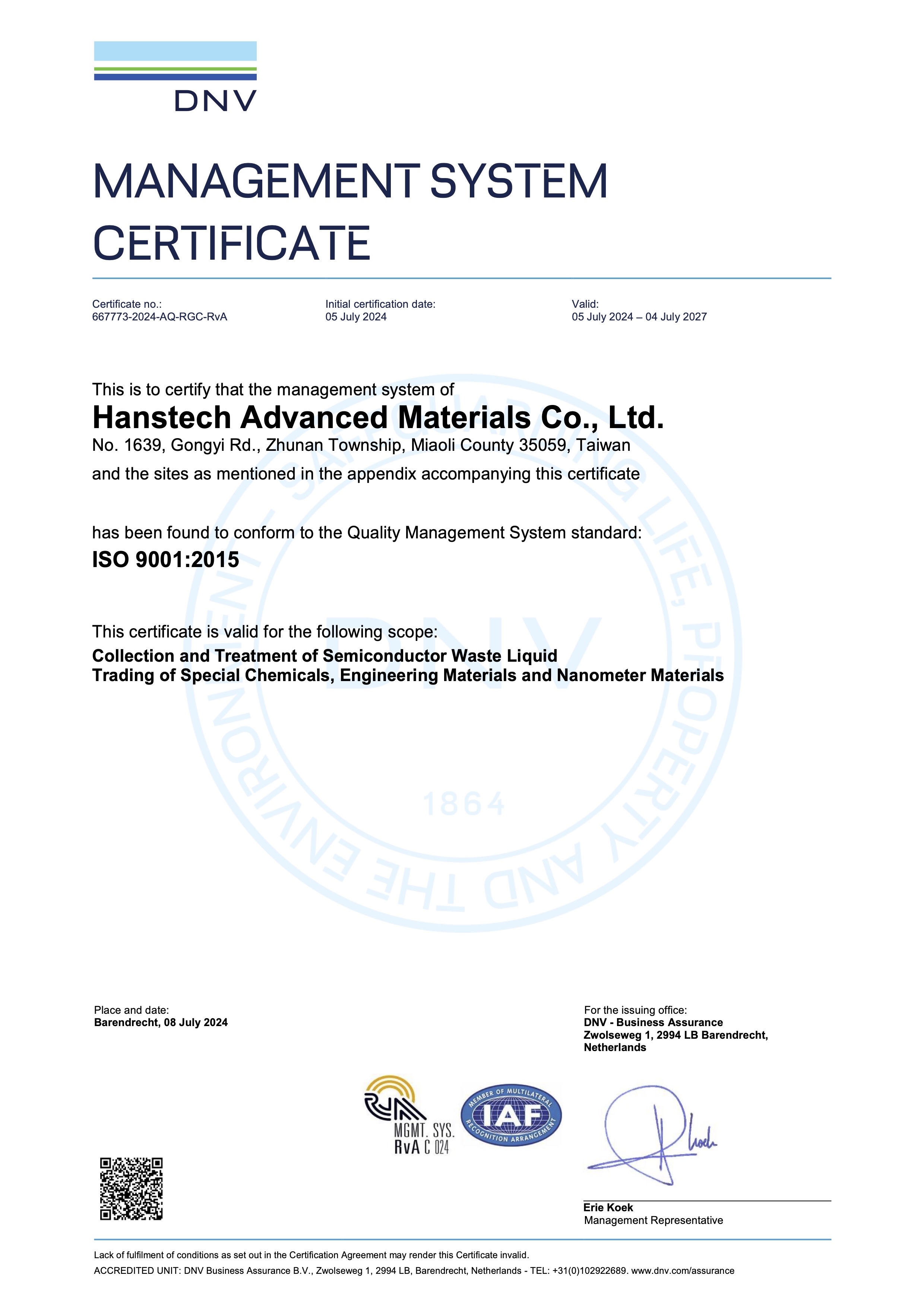Sales of Patented Formulas for Reuse of Semiconductor Process Waste Liquid