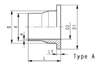 | 產品編號 | 名稱 | d(mm) | DN(mm) | PN(bar) | D(mm)2 | D1(mm) | D2(mm) | D3(mm) | e(mm) | L(mm) | L1(mm) | L2(mm) | Type |